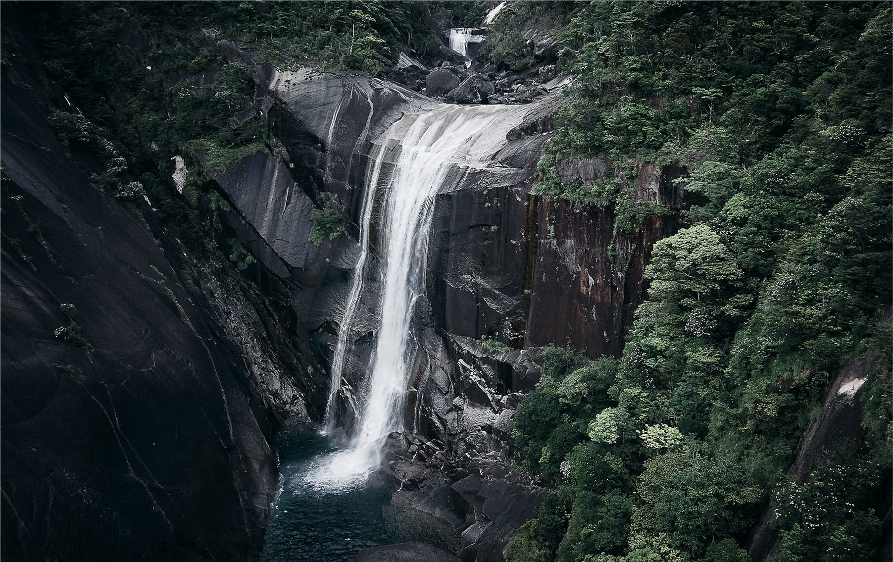 千尋の滝は、モッチョム岳の裾の巨大な花崗岩の岩盤を鯉之川が刻んで、迫力あるV字谷が生まれたといわれています。滝の落差は約60メートル。滝の中央から大量の水が流れ落ちる様は圧巻です。