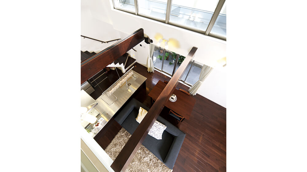 ご要望は「家族の気配を感じられる住まい」 料理をしながらでもお部屋を見わたせるように、キッチンの背面に階段を設け、和室やテラスはリビングからひと続きにしました。 2階ホールの壁は強化ガラスで造作する事で、お子さまがお部屋で遊んでいてもキッチンから気配を感じる事が出来きるように。 家族が自然に顔を合わせ、会話が生まれる動線づくりを心がけました。