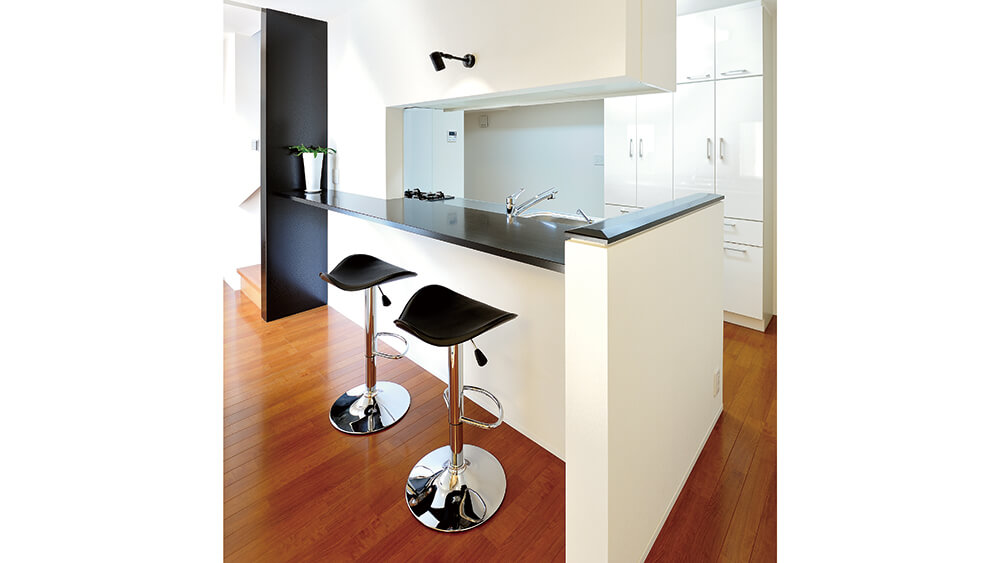 階段手摺は「既製品でないものを」とのご要望にお応えして造作で仕上げ、壁には地模様がモダンなメラミン化粧版を。