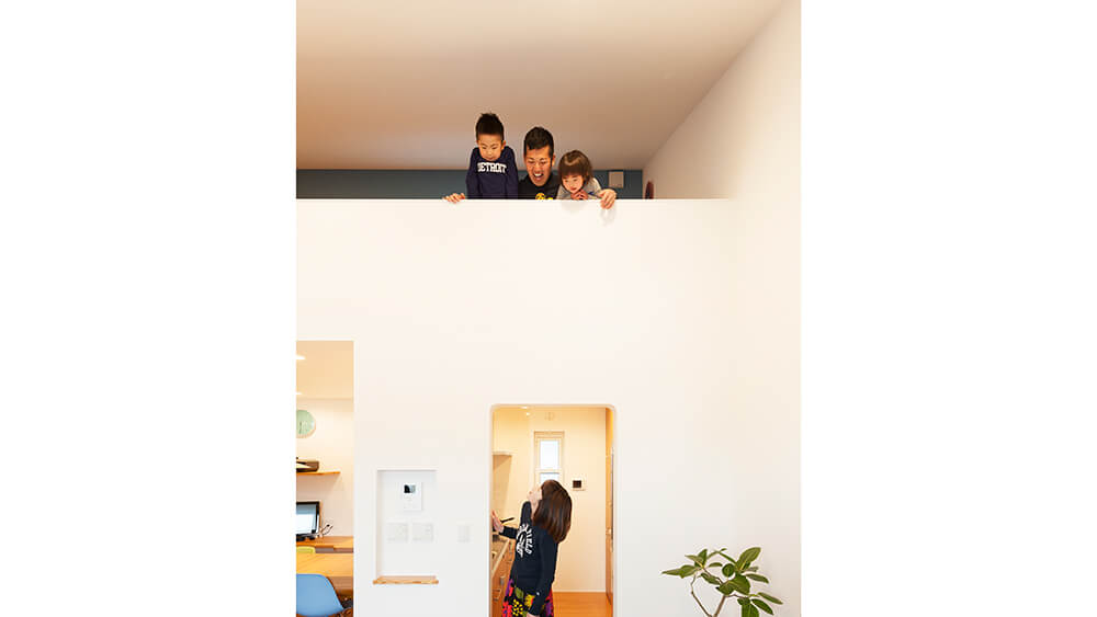 「開放的なリビングに憧れはあるものの、吹抜けまでは…」というご相談を受け、建築士が提案したのはロフトと勾配天井を活かし、天井高を確保したプラン。