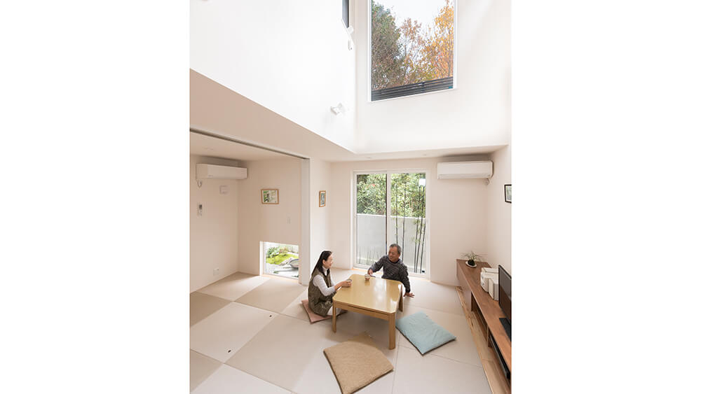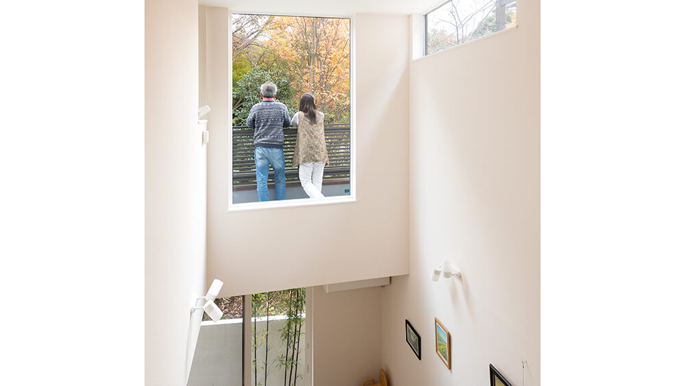 吹抜けの大きな窓からはたっぷりの採光が降り注ぎ、季節の移ろいを感じるLDK。