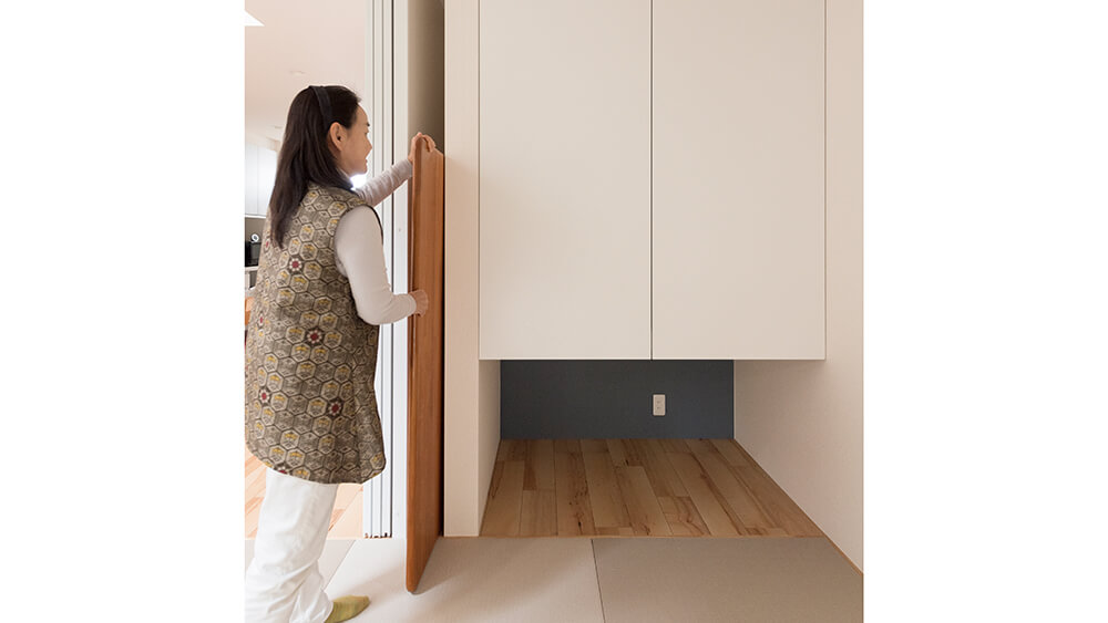 「月を眺めながら過ごしたい」という要望を受けて、バルコニーの格子を敢えて内側に向けて設置し、雰囲気を良く仕上げています。