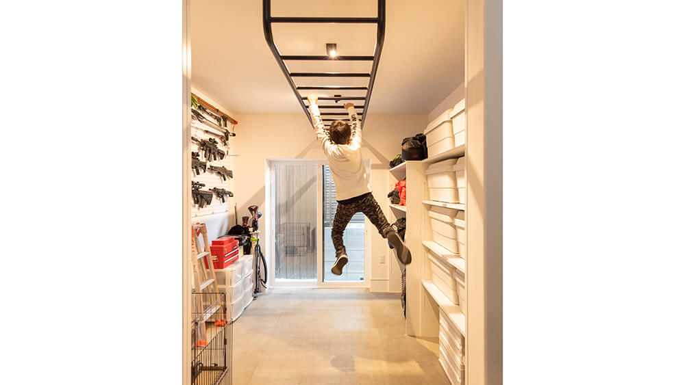 子供たちが1年を通して快適に練習することが出来る、吹き抜けの壁に設置したバスケットゴールや来客の目を惹くスタイリッシュな鉄骨階段と、