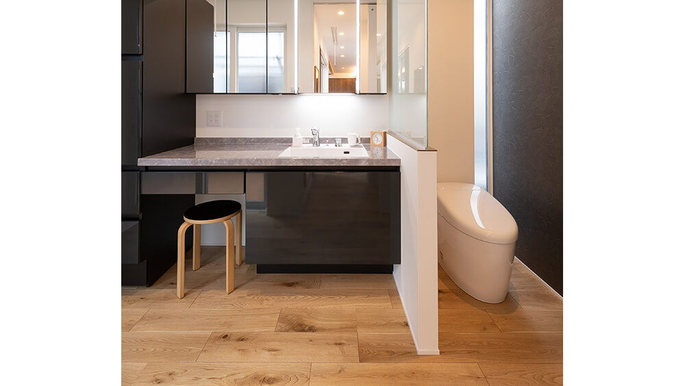 「間接照明を配した下がり天井」「木目の軒裏」「仕切りのないLDK」「ホテルライクな洗面スペース」など、こだわりのデザイン性を兼ね備えた満足度の高い住まいが完成しました。