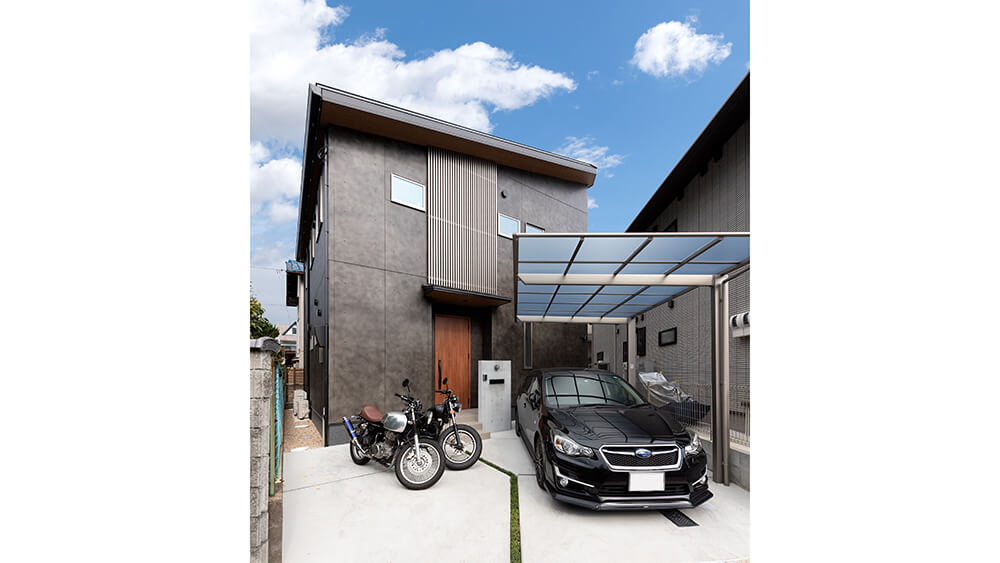 マットなダークカラーとシャープなフォルムの外観。室内に入るとブルックリンスタイルでコーディネイトされた造作家具に目を奪われ、