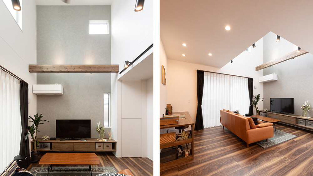 - リビングが特に気に入っており、吹き抜けで開放感があること、壁の一面をモルタル風にしたことが満足です。