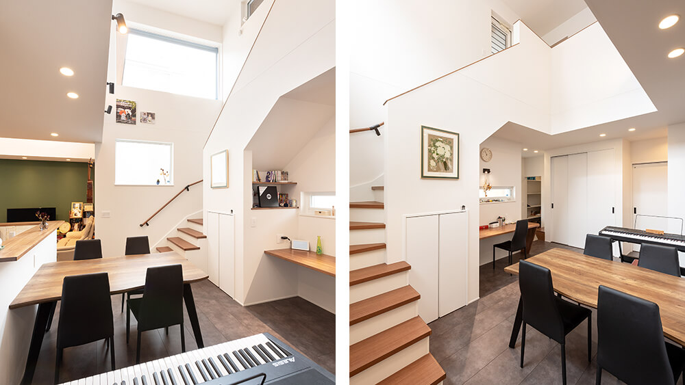 吹き抜けが2つある珍しい間取りの上部につけられた大きな窓から光をたっぷりと取り込む設計で、曇りの日でも明るく、窓を開ければ家じゅうを心地よい風が流れます。