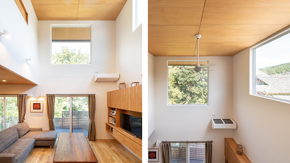 また「北側に広がる森林を室内からも楽しみたい。」という奥様の希望もかなえるため、北側に吹き抜けと大きな窓をつけ、さらに採光が不足しないよう東側にも窓を設置しました。