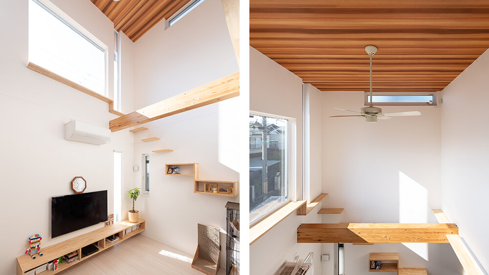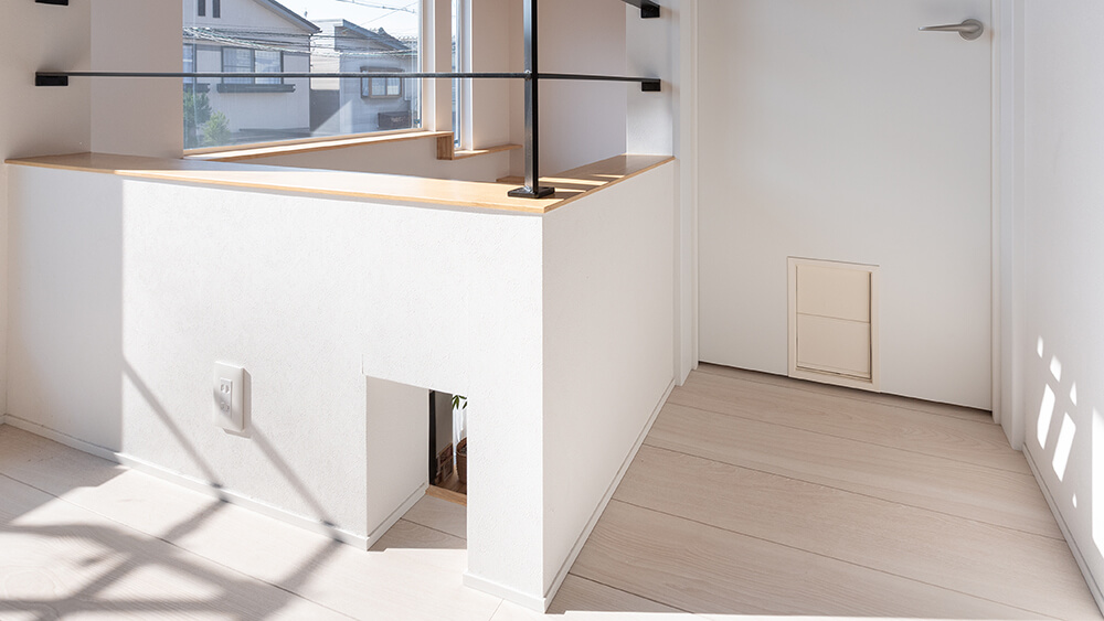 2匹の猫ちゃんのためにリビングの吹き抜けにキャットウォークを設置。それぞれの寝室の扉にもペットドアを設け、猫ちゃんが自由に出入りできるようにしました。