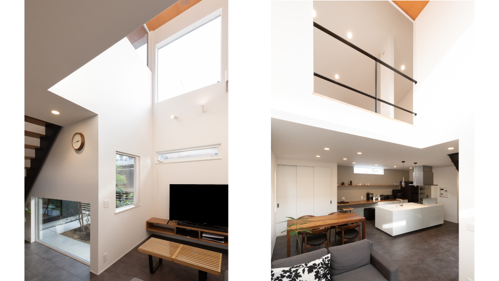 - ・リビングの吹き抜け。高窓を見上げた時に空だけが見えて、天気の良い日は本当に気持ちが良い